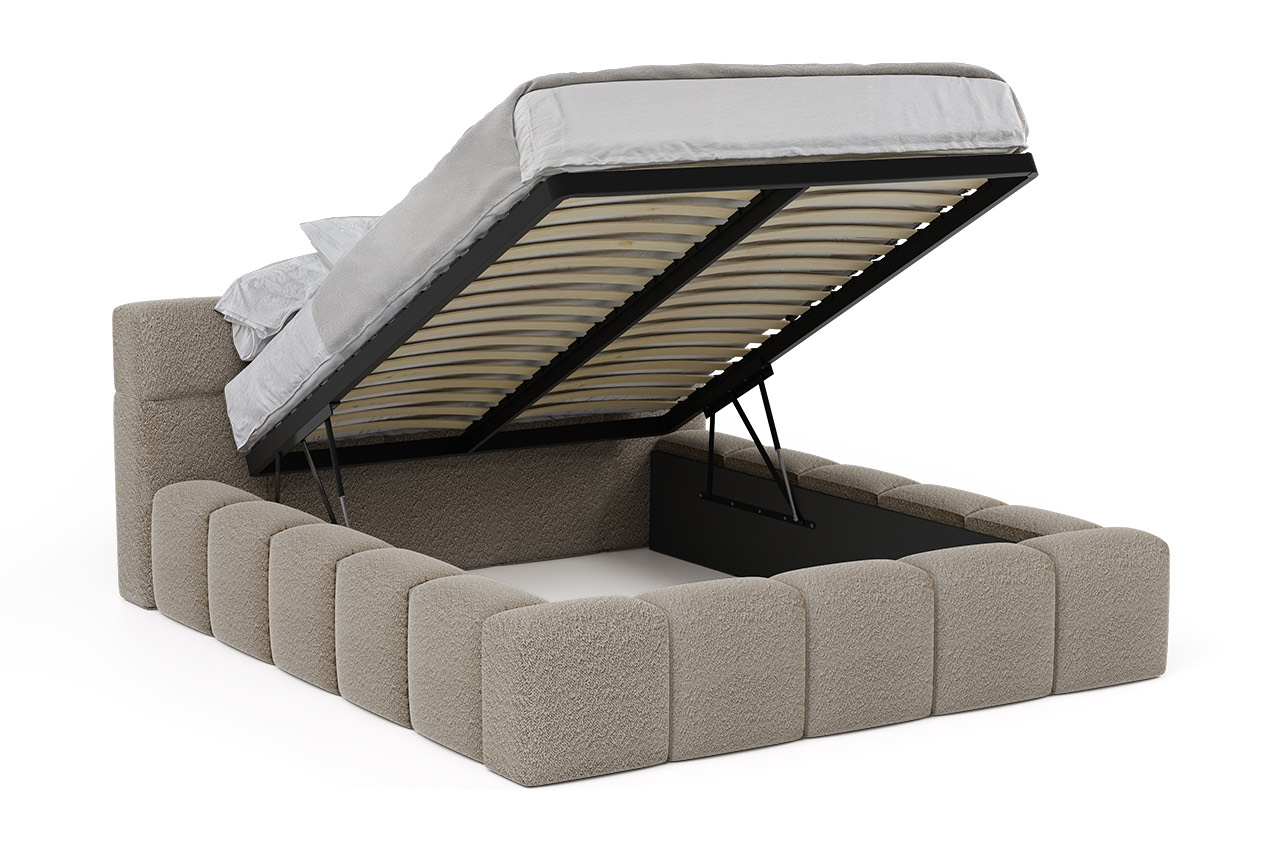 Tkanina boucle nadaje mu przytulność i szlachetną strukturę, a masywna forma zapewnia stabilność oraz efekt „soft luxury”, który przyciąga wzrok w każdej sypialni.
