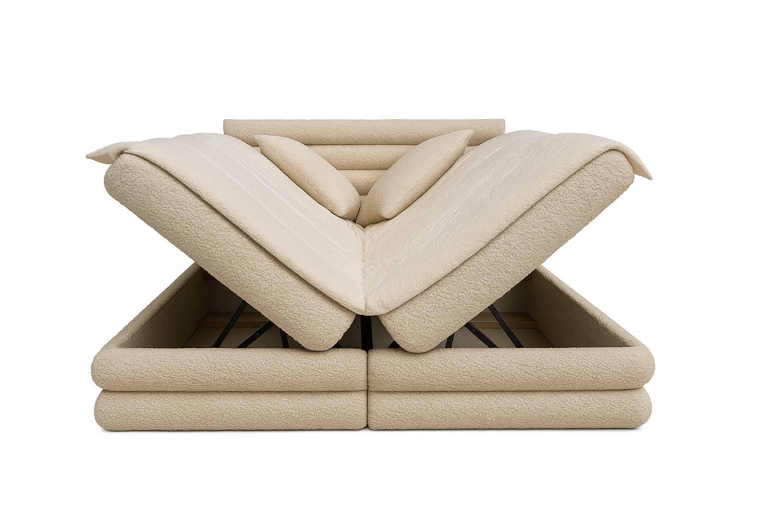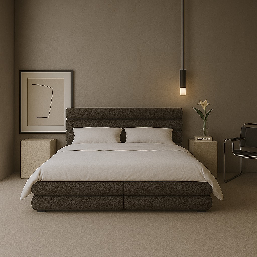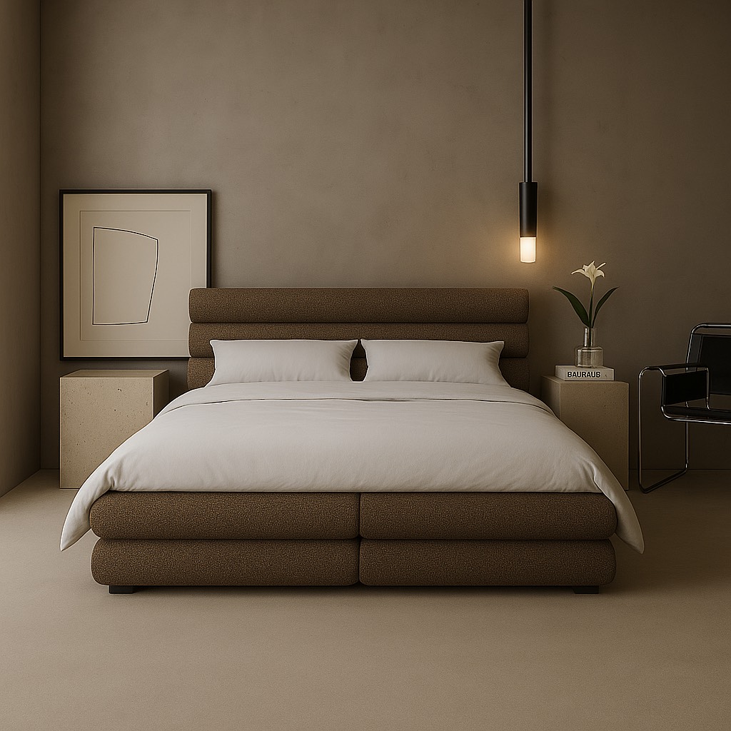 Łóżko, które łączy miękką architekturę z ponadczasowym minimalizmem. Harmonijne proporcje, obłe formy i luksusowa tkanina tworzą przestrzeń, w której ciało naprawdę odpoczywa. Subtelna elegancja, która koi zmysły każdego dnia.