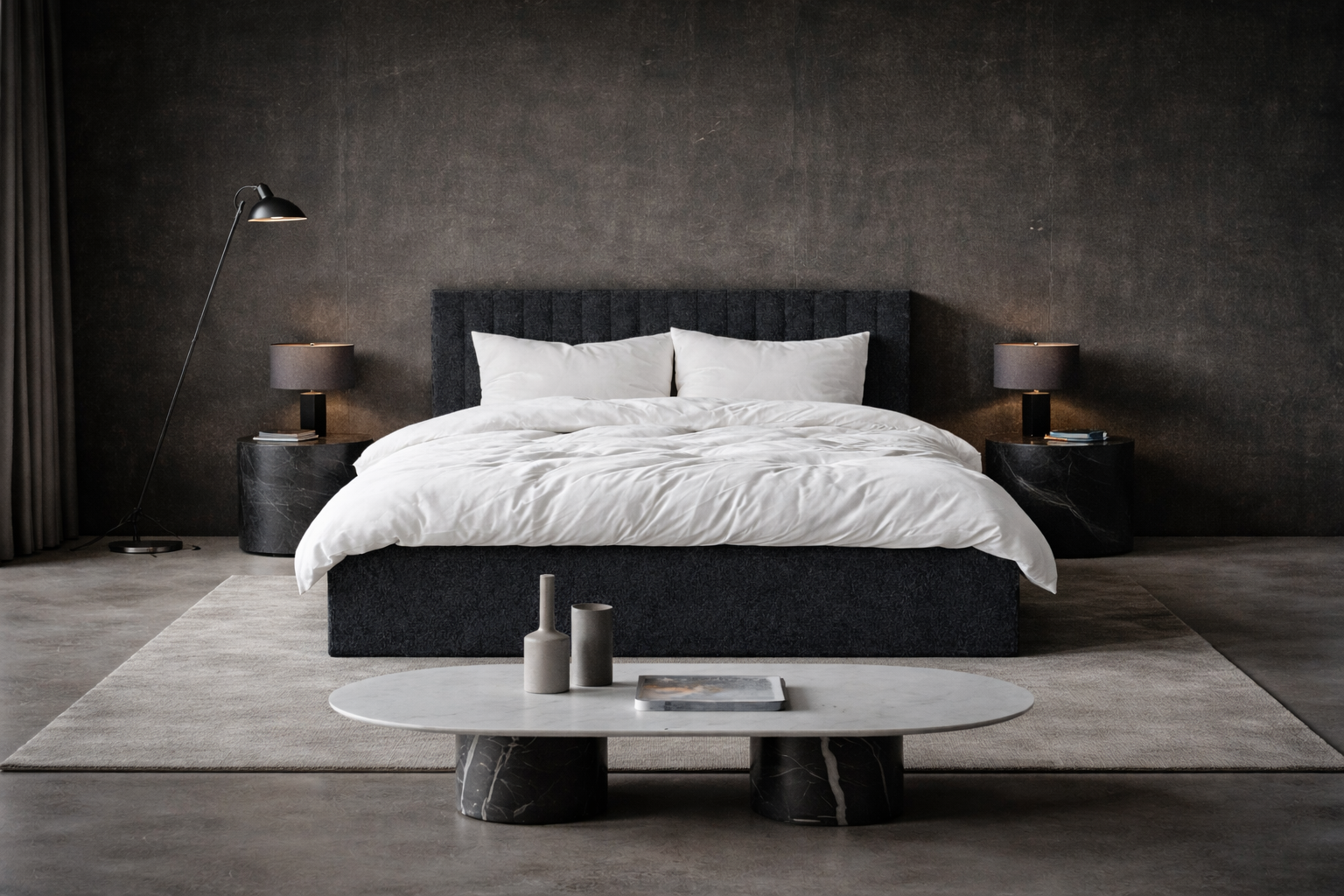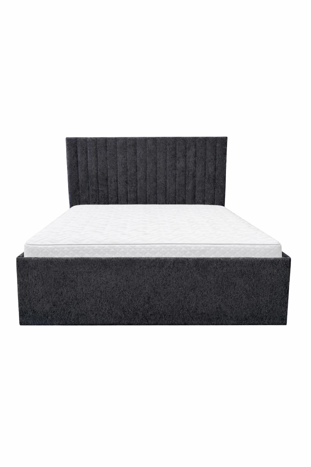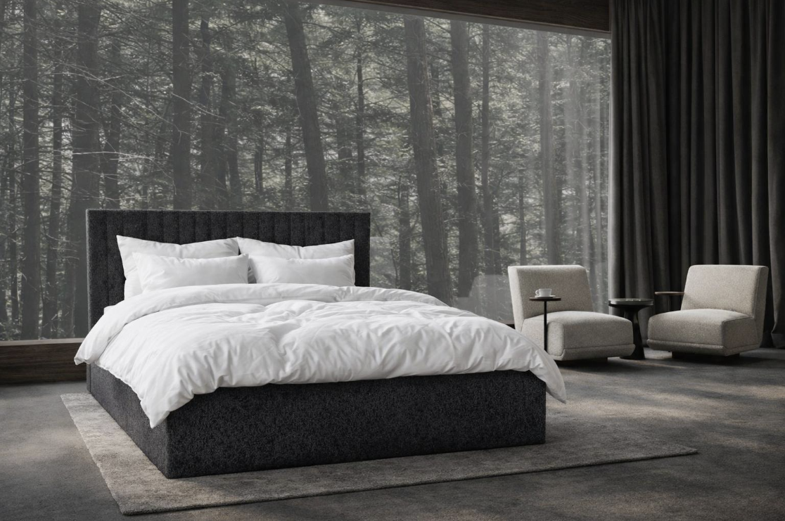 Nowoczesne łóżko tapicerowane w głębokim, eleganckim odcieniu z wyraźną strukturą tkaniny. Prosta forma została przełamana miękkimi, pionowymi panelami – każdy indywidualnie obszyty, co podkreśla rzemieślniczy charakter łóżka i dbałość o każdy detal.